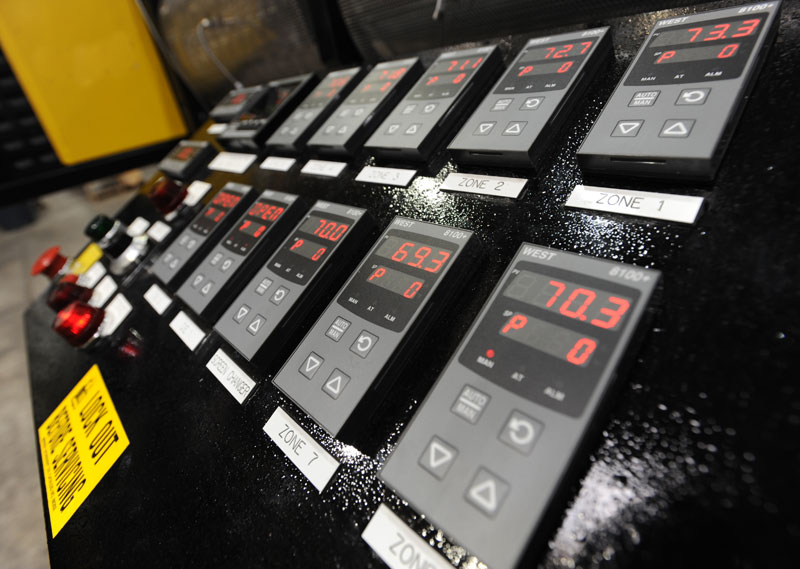 R&B offers discrete or PLC-based MAX Extrusion Control systems to provide total line control. You may specify any brand of discrete temp control as well as any PLC platform (programmable logic control) such as Allen-Bradley, Siemens, Vario, Automation Direct or others. Sample HMl (human machine interface) screens are pictured below. Contact R&B for further information about our controls systems, call 734-429-9421 or email info@rbplasticsmachinery.com